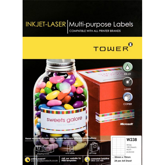 Tower A4 Inkjet-Laser Labels - MCS Office Supplies 64 x 33.9mm Label Size 24 Labels per Sheet 100 Sheets of Tower W109 Labels per Pack A4 Sheet size A4 Tower Adhesive LabelsAn extensive range of A4 Tower labels and label printing software allows you to design and print your own inkjet labels and laser labels for almost any occasion.. R245.00. Ex Tax:R213.04.