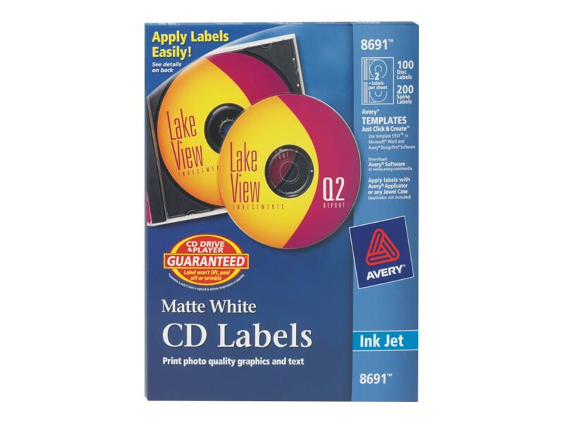 CD Labels | J8676-100 | Avery CD Labels J8676-100 CD Labels 117 mm, Inkjet, Matt Product Code J8676-100 Content 200 Labels / 100 Sheet Available £30.08 Free for UK orders over £40 Standard Delivery £2.99 All prices incl. tax and if applicable plus shipping costs. Software & Templates Click here to design and print this product
