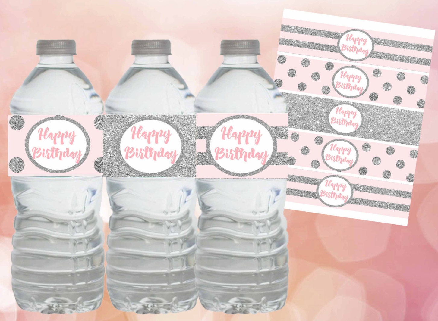 Pink and Silver water bottle labels,Pink and silver Birthday decorations,Pink and silver labels Pink and silver birthday party,Digital file.